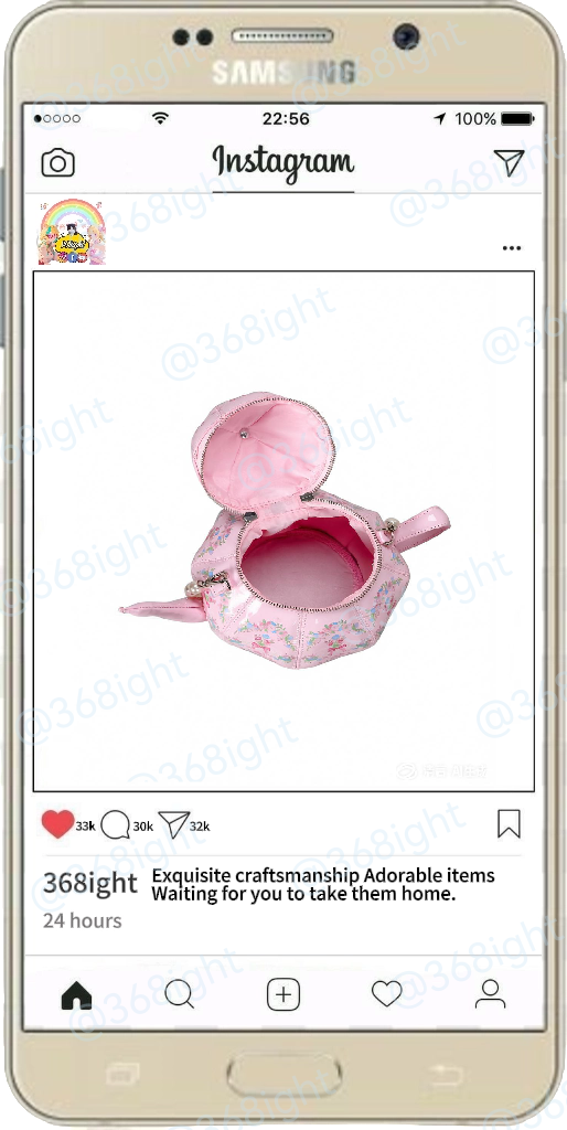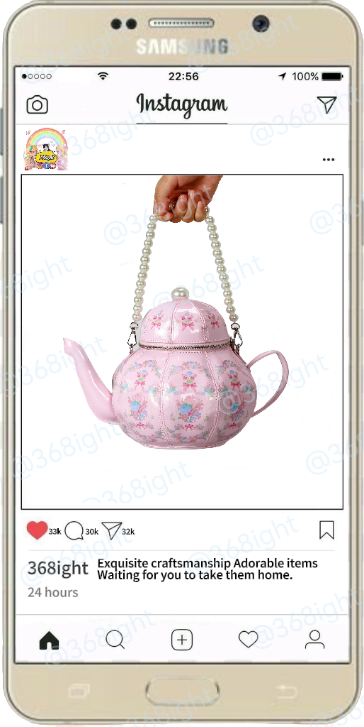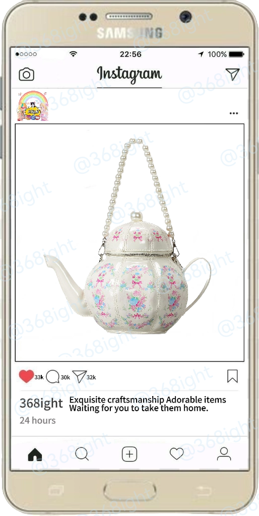 這款包以《愛麗絲夢遊仙境》中經典的「瘋狂茶會」為靈感,將童話的荒誕與時尚的可愛完美融合。包包整體呈現茶壺造型,尺寸為長20cm、寬11cm、高25cm,比例協調,既保留了茶壺的立體感,又兼顧了日常使用的實用性。壺嘴、壺把與壺蓋的細節設計精緻逼真,搭配珍珠鏈肩帶,彷彿下一秒就會飄出伯爵茶的香氣,讓你化身仙境中的「茶話會主角」。